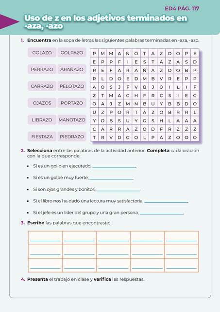 Escritura divertida 4 ED4 PAG.117 15 de enero de 202423 de agosto de 2024 Uso de la z en los adjetivos terminados en aza, azo Descargar QR