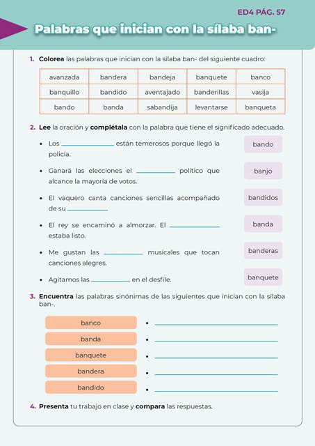 Escritura divertida 4 ED4 PAG.57 15 de enero de 202423 de agosto de 2024 Palabra que inician con la sílaba ban- Descargar QR