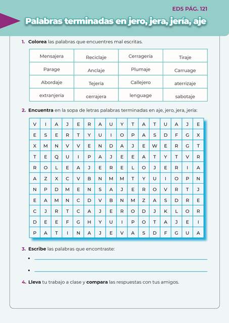 Escritura divertida 5 ED5 PAG.121 12 de enero de 202423 de agosto de 2024 Palabras terminadas en jero, jera, jería, aje Descargar QR